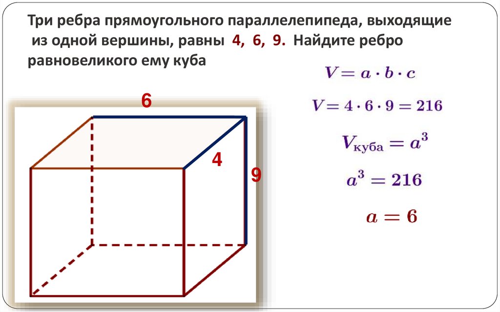 Три ребра прямоугольного параллелепипеда, выходящиеиз одной вершины, равны 4, 6, 9. Найдите ребро