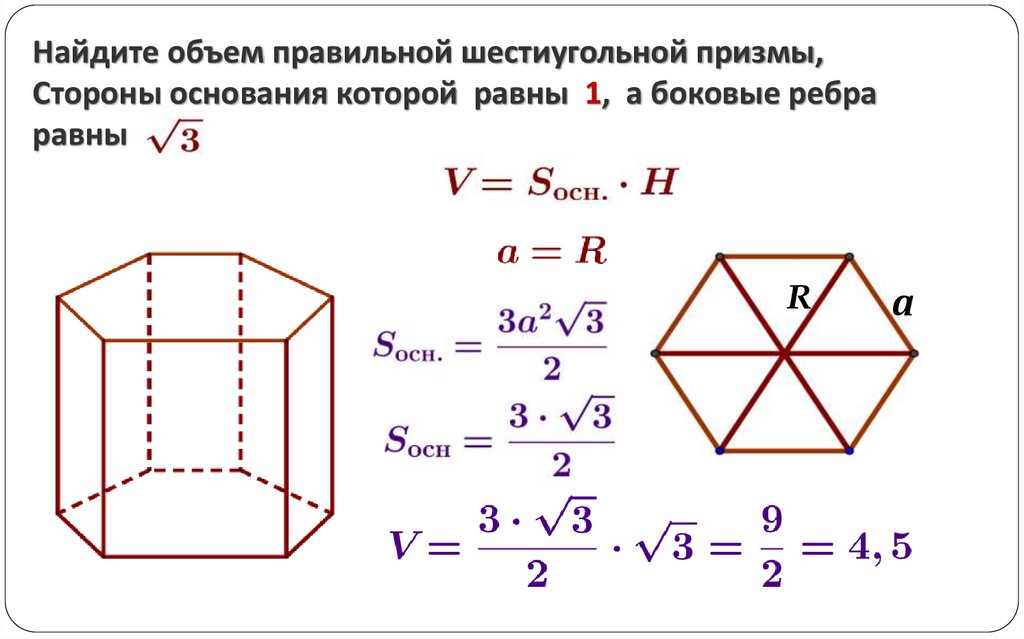 Найдите объем правильной шестиугольной призмы,Стороны основания которой равны 1, а боковые ребра