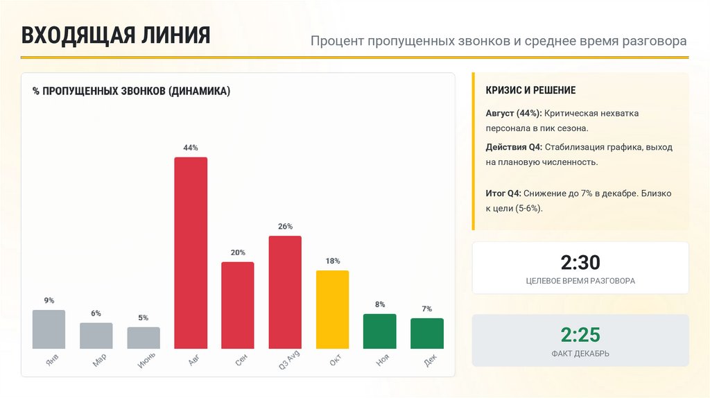 ВХОДЯЩАЯ ЛИНИЯПроцент пропущенных звонков и среднее время разговора