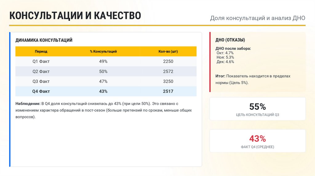 Наблюдение: В Q4 доля консультаций снизилась до 43% (при цели 50%). Это связано с