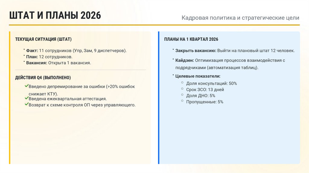 • Факт: 11 сотрудников (Упр, Зам, 9 диспетчеров).