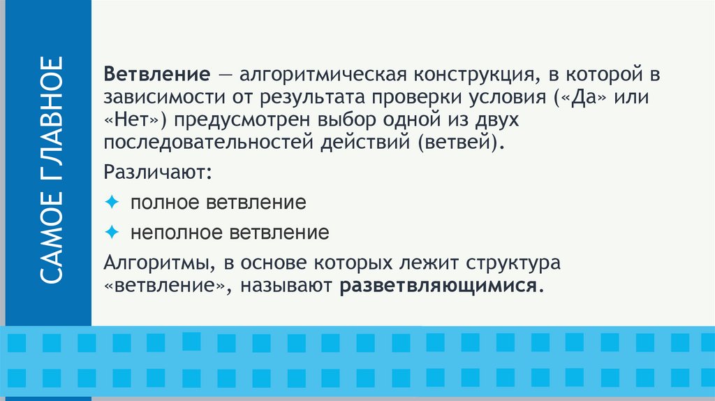 САМОЕ ГЛАВНОЕВетвление — алгоритмическая конструкция, в которой в