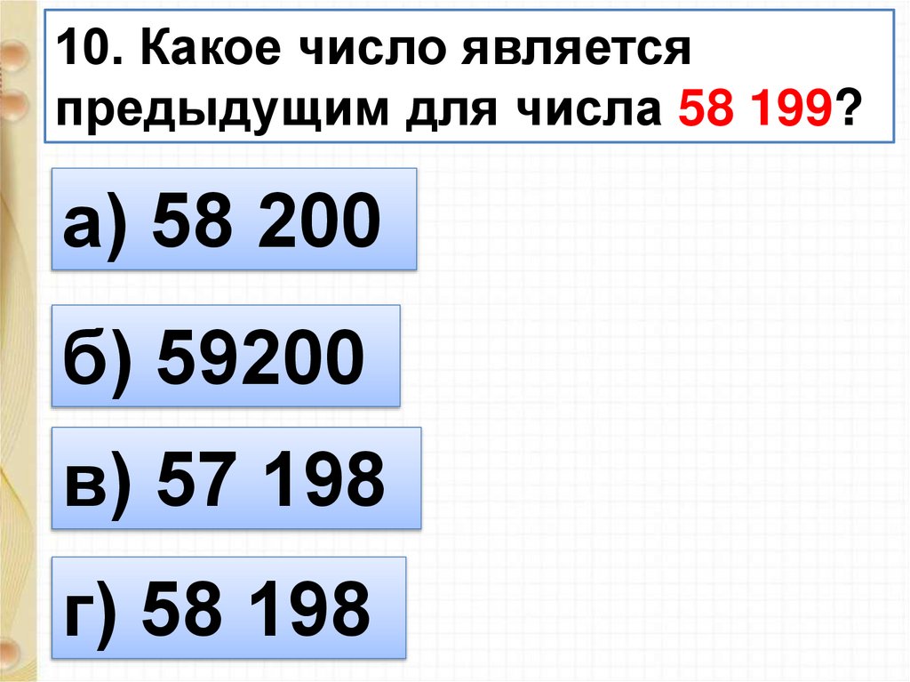 10. Какое число являетсяпредыдущим для числа 58 199?