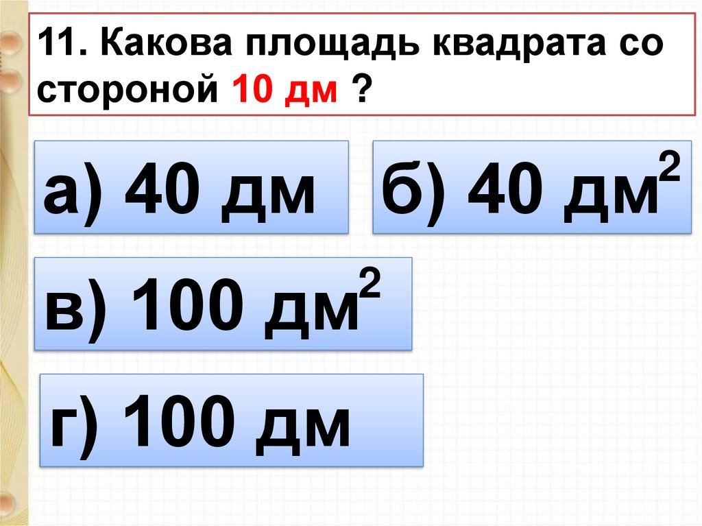 11. Какова площадь квадрата состороной 10 дм ?