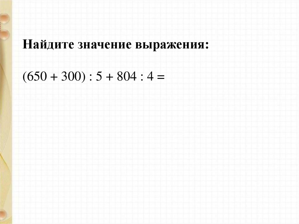 Найдите значение выражения:(650 + 300) : 5 + 804 : 4 =