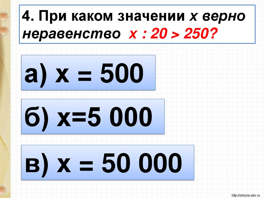 4. При каком значении х вернонеравенство х : 20 > 250?