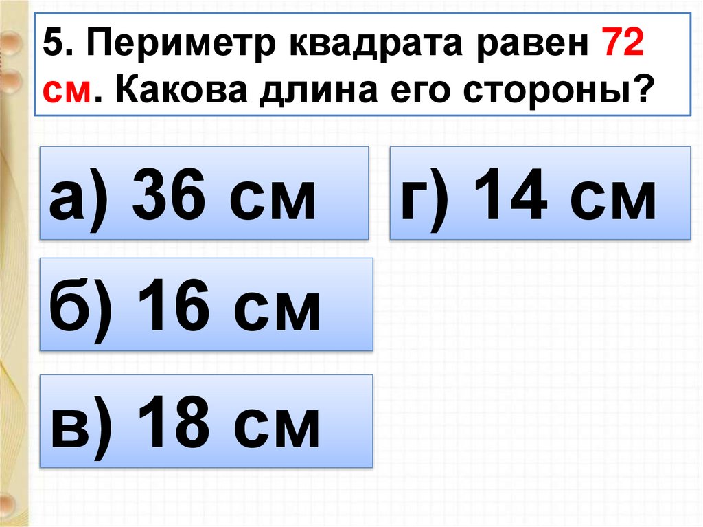 5. Периметр квадрата равен 72см. Какова длина его стороны?