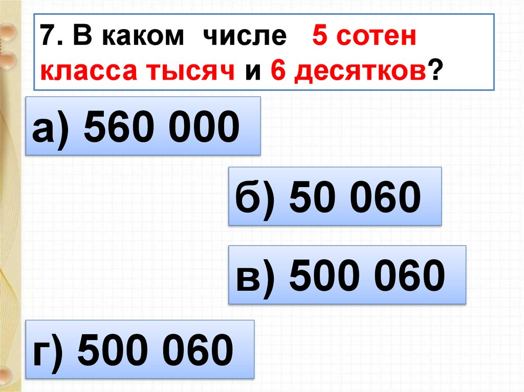 7. В каком числе 5 сотенкласса тысяч и 6 десятков?