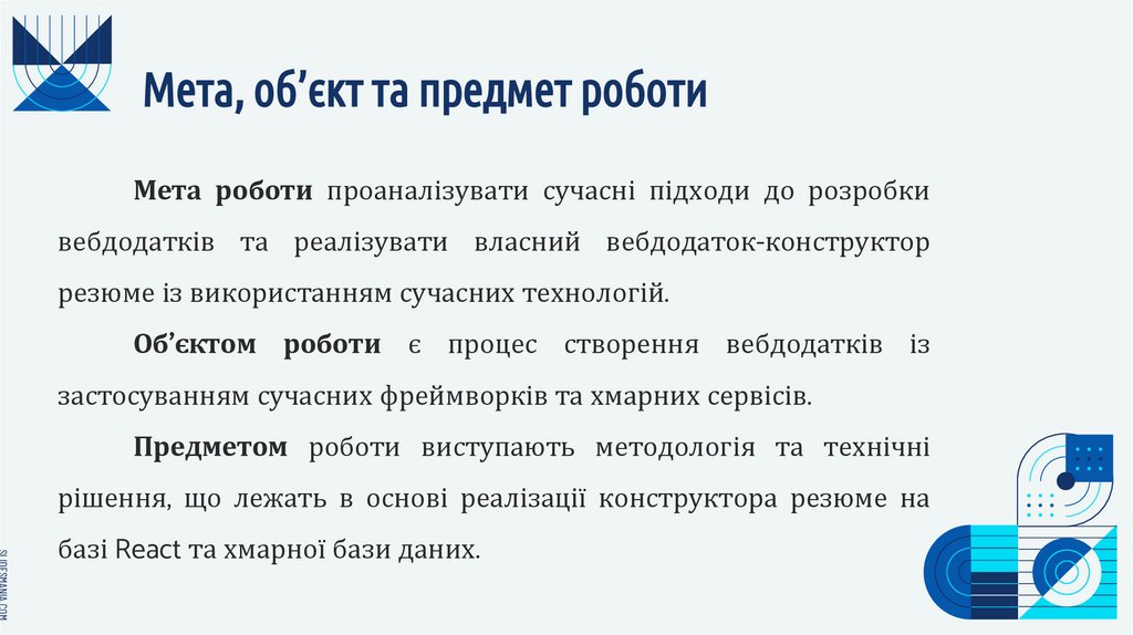 Мета, об’єкт та предмет роботиМета роботи проаналізувати сучасні підходи до розробки