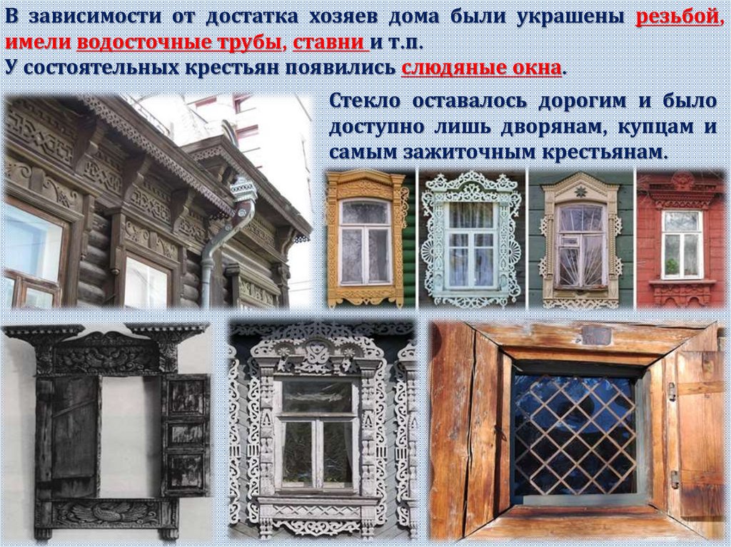 В зависимости от достатка хозяев дома были украшены резьбой,имели водосточные трубы, ставни и т.п.