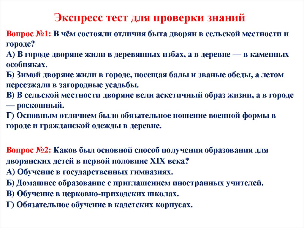 Экспресс тест для проверки знанийВопрос №1: В чём состояли отличия быта дворян в сельской местности и