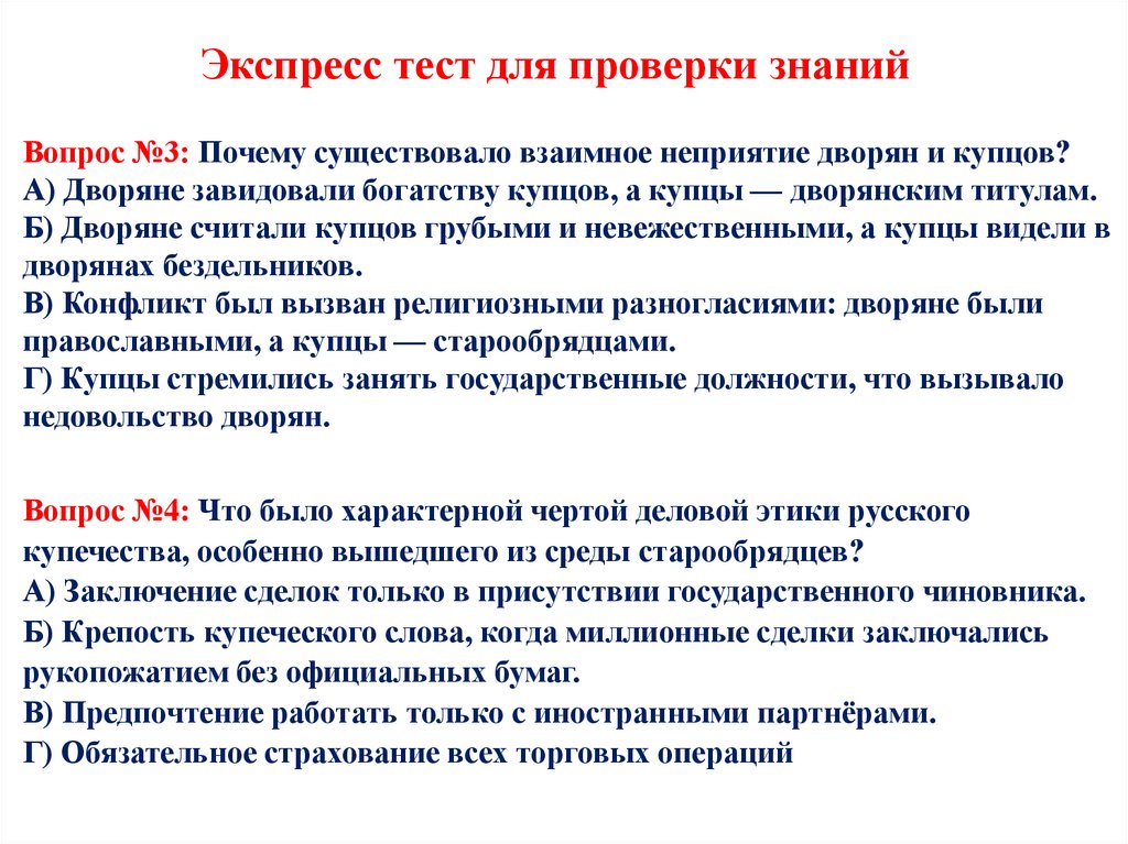 Экспресс тест для проверки знанийВопрос №3: Почему существовало взаимное неприятие дворян и купцов?