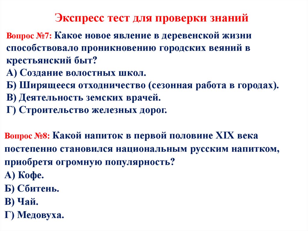 Экспресс тест для проверки знанийВопрос №7: Какое новое явление в деревенской жизни