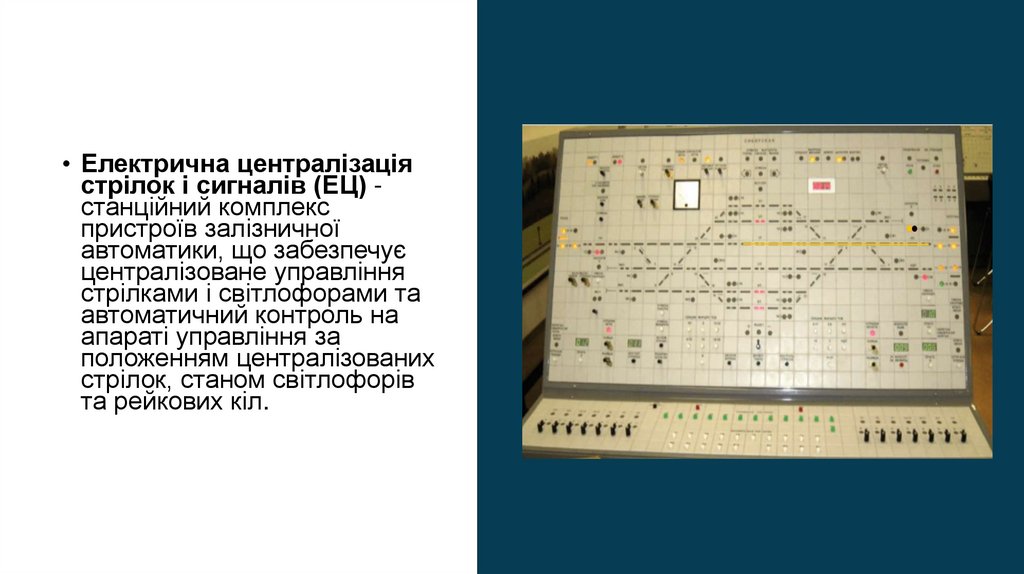 • Електрична централізаціястрілок і сигналів (ЕЦ) станційний комплекс