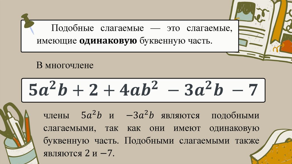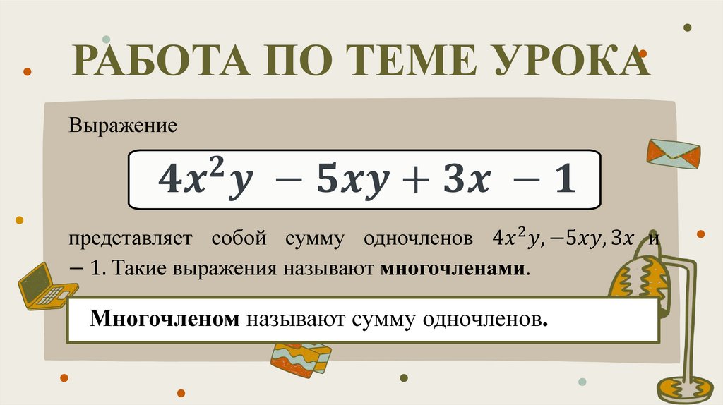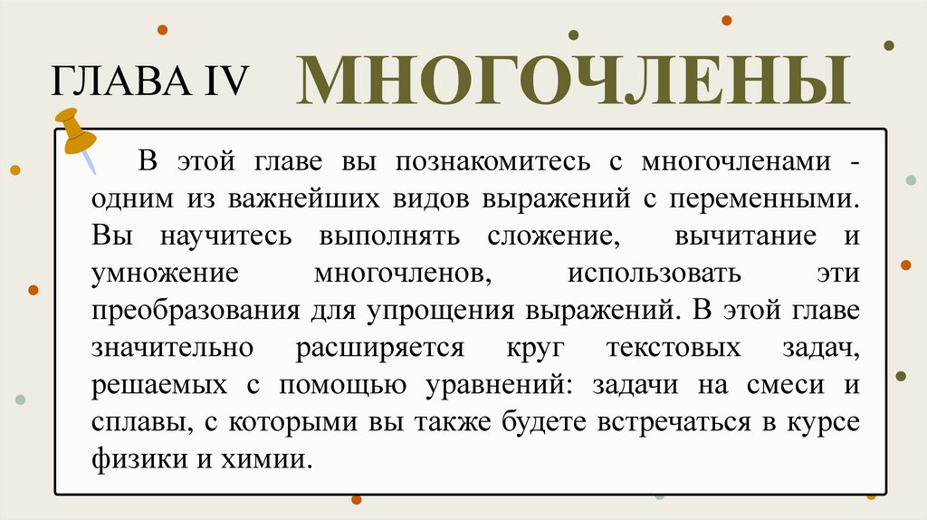 В этой главе вы познакомитесь с многочленами одним из важнейших видов выражений с переменными.