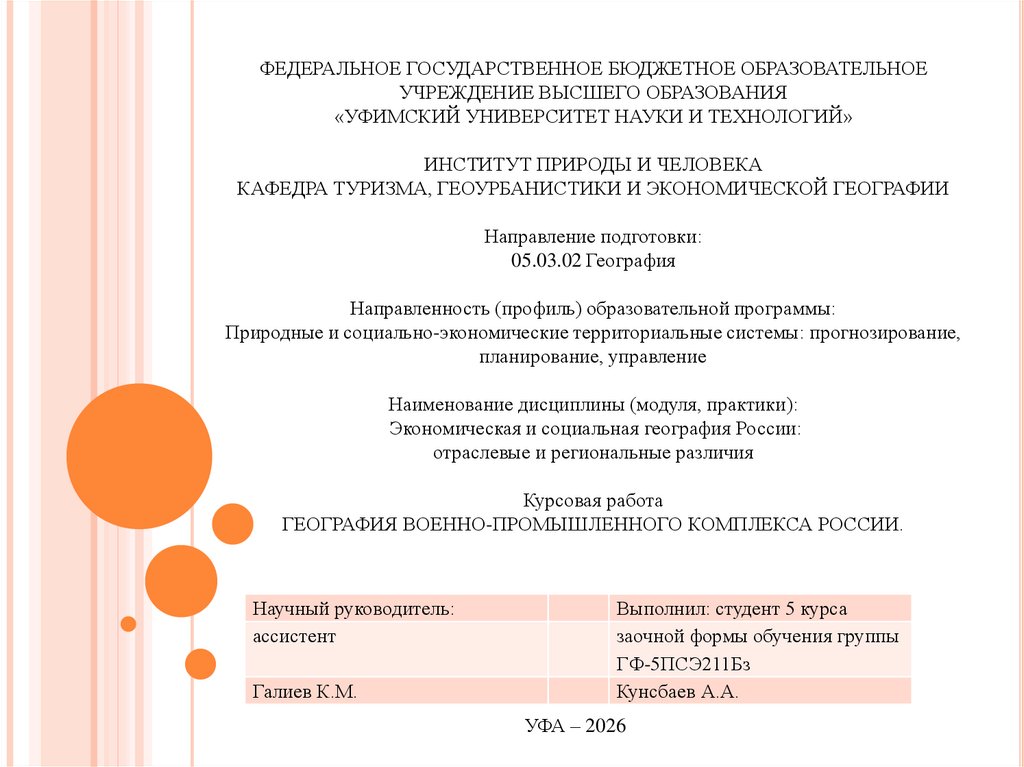 КУРСОВАЯ РАБОТА ПО ТЕМЕ: «ГЕОГРАФИЯ ВОЕННО-ПРОМЫШЛЕННОГО КОМПЛЕКСА РОССИИ»ВЫПОЛНЕНА СТУДЕНТОМ ГРУППЫ ГФ-5ПСЭ211БЗ 5 КУРСА НАПРАВЛЕНИЯ «ГЕОГРАФИЯ»