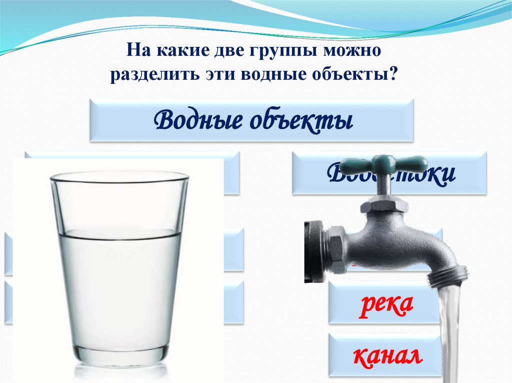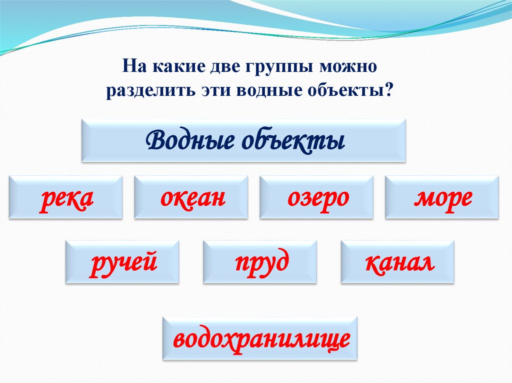 На какие две группы можноразделить эти водные объекты?