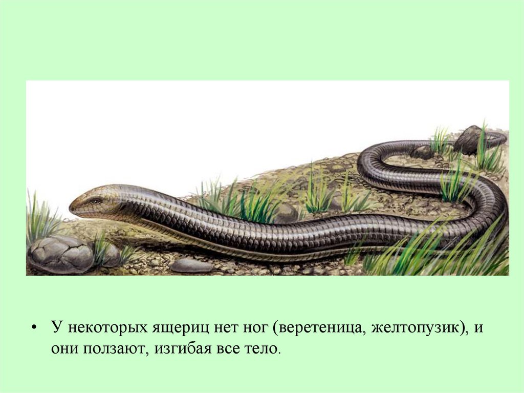 • У некоторых ящериц нет ног (веретеница, желтопузик), иони ползают, изгибая все тело.