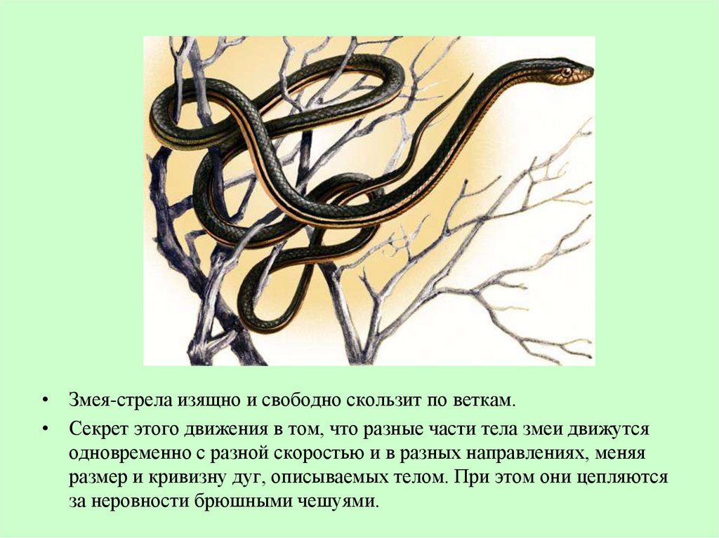 • Змея-стрела изящно и свободно скользит по веткам.• Секрет этого движения в том, что разные части тела змеи движутся