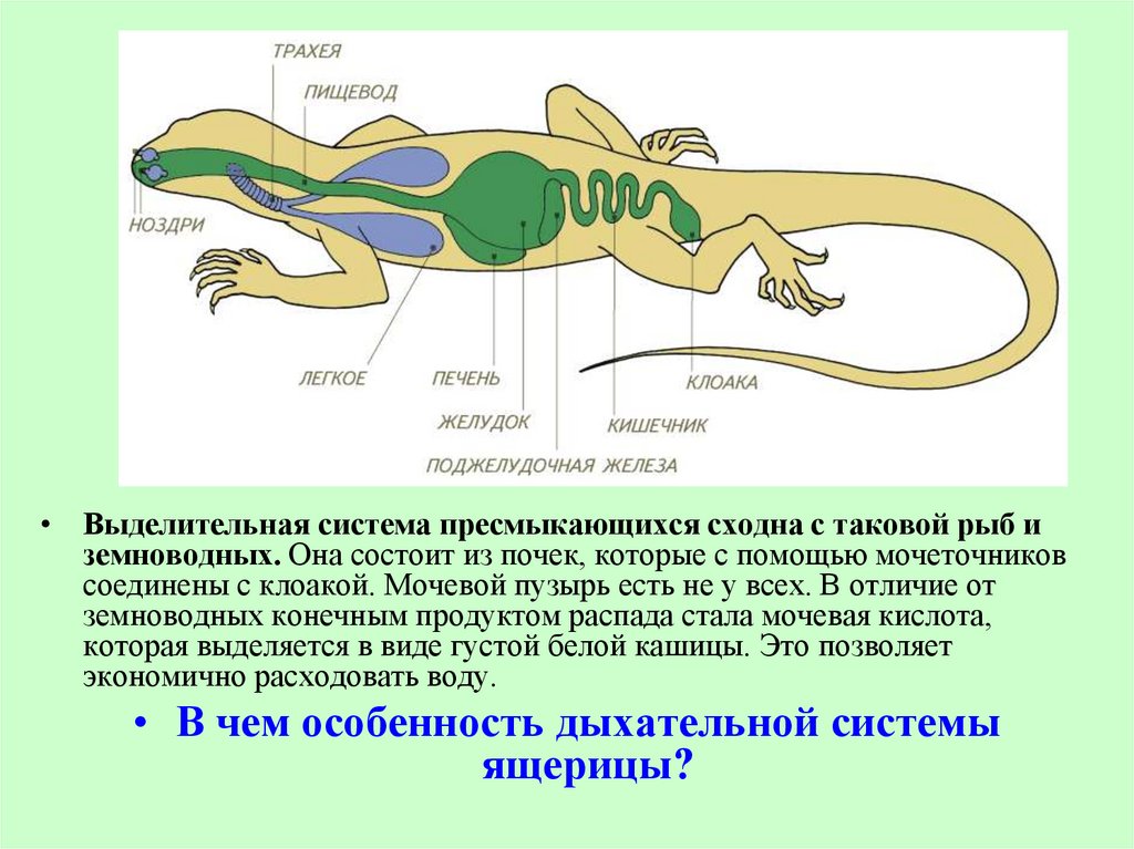 • Выделительная система пресмыкающихся сходна с таковой рыб иземноводных. Она состоит из почек, которые с помощью мочеточников