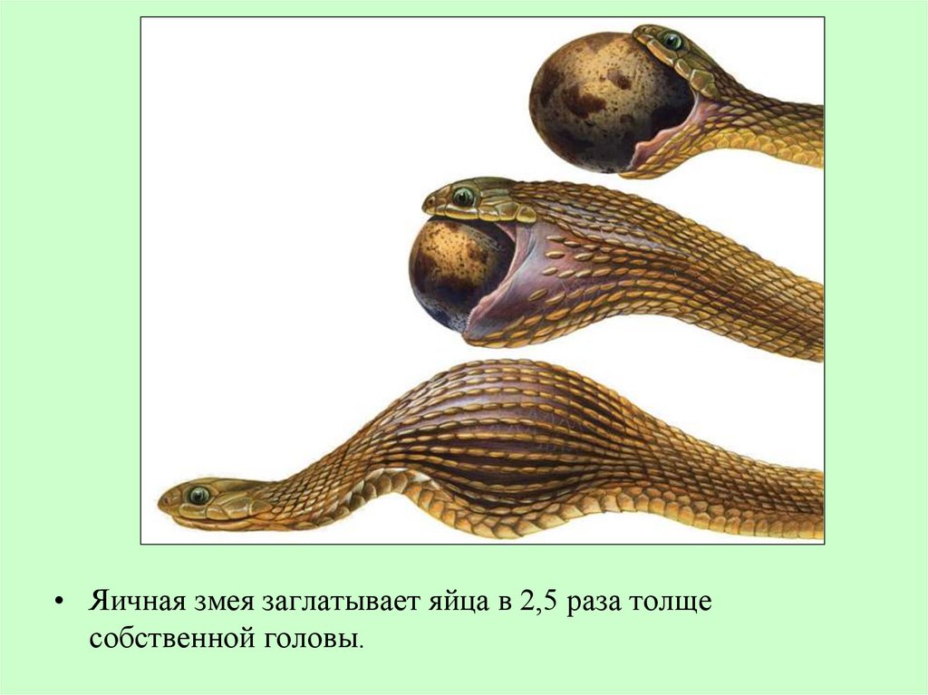 • Яичная змея заглатывает яйца в 2,5 раза толщесобственной головы.