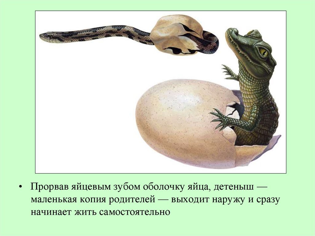 • Прорвав яйцевым зубом оболочку яйца, детеныш —маленькая копия родителей — выходит наружу и сразу