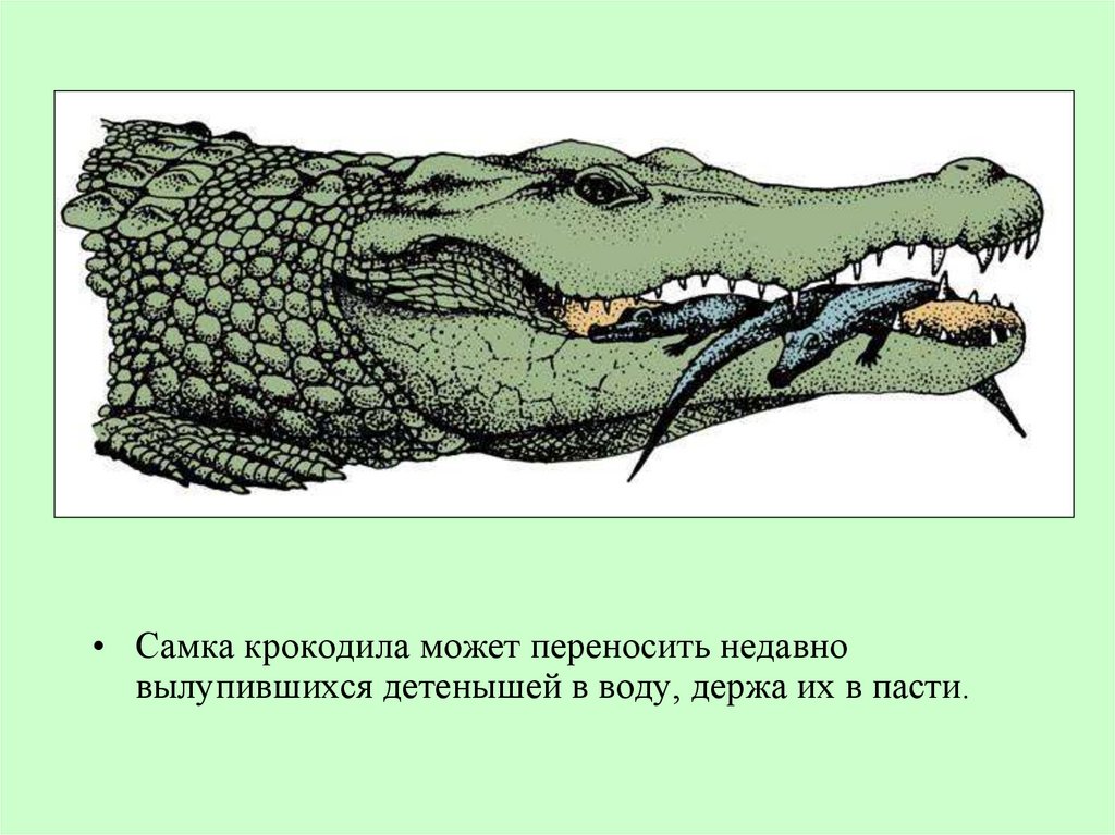 • Самка крокодила может переносить недавновылупившихся детенышей в воду, держа их в пасти.
