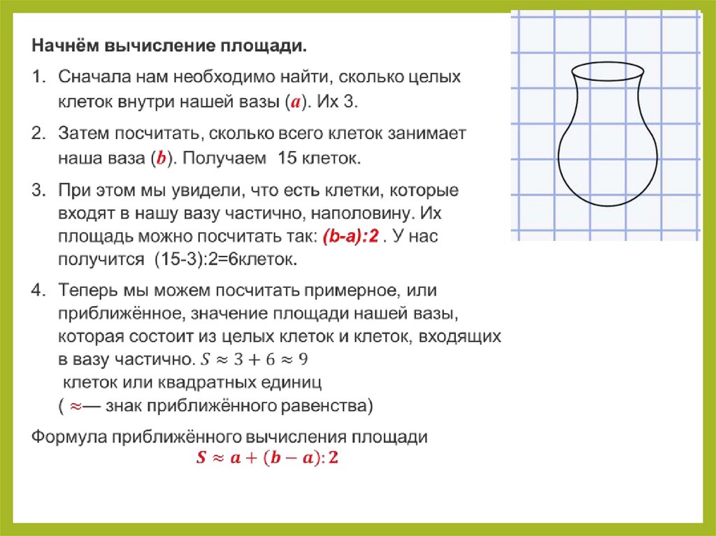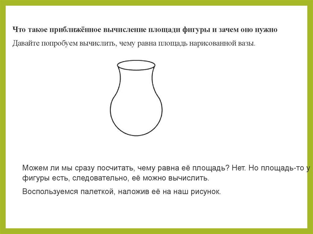 Что такое приближённое вычисление площади фигуры и зачем оно нужноДавайте попробуем вычислить, чему равна площадь нарисованной вазы.