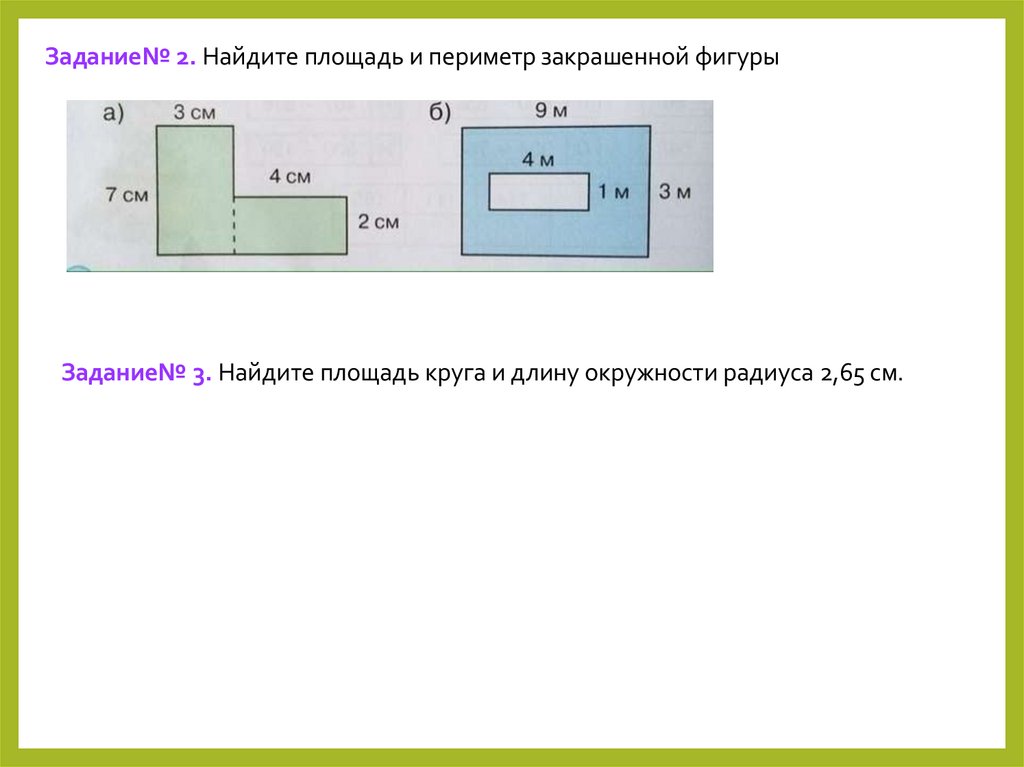 Задание№ 2. Найдите площадь и периметр закрашенной фигурыЗадание№ 3. Найдите площадь круга и длину окружности радиуса 2,65 см.