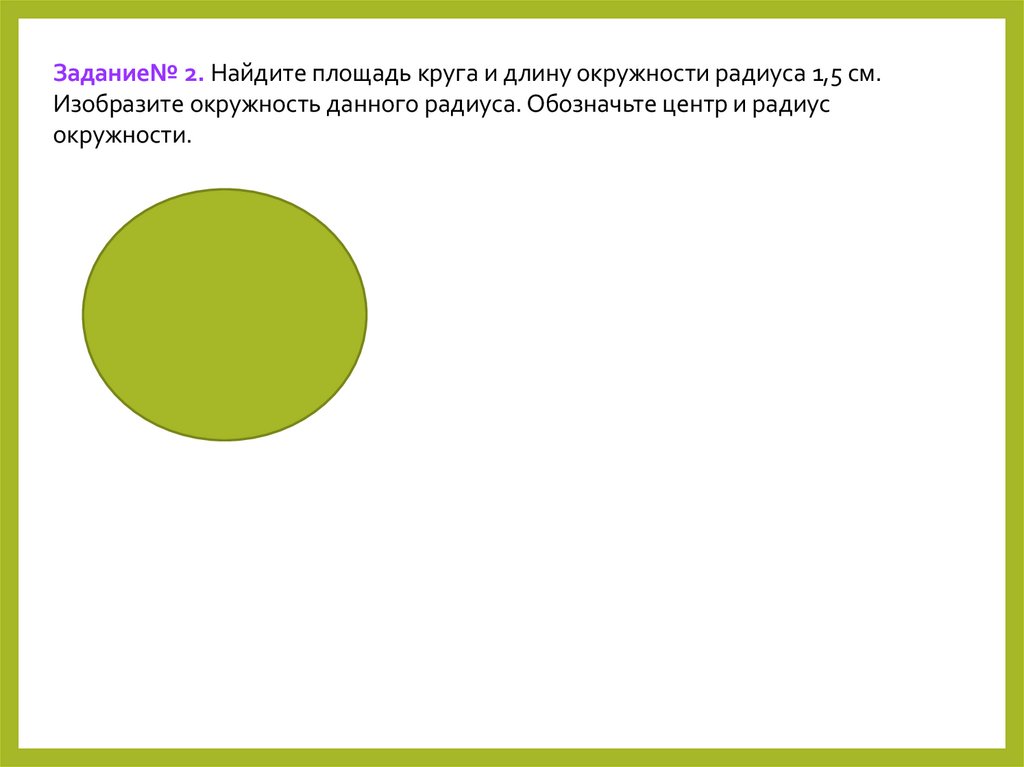 Задание№ 2. Найдите площадь круга и длину окружности радиуса 1,5 см.Изобразите окружность данного радиуса. Обозначьте центр и радиус