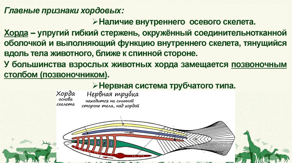 Главные признаки хордовых:Наличие внутреннего осевого скелета.