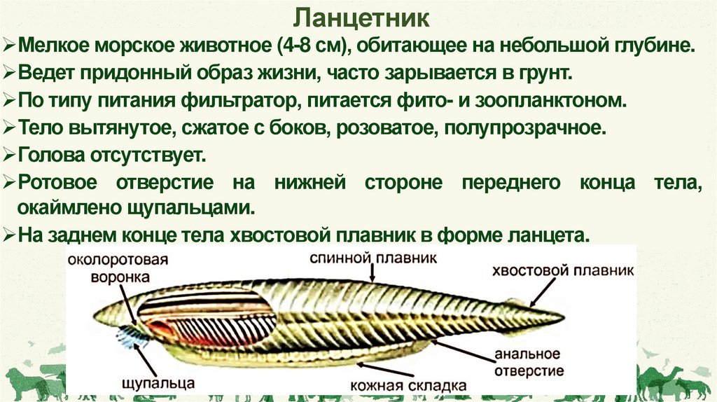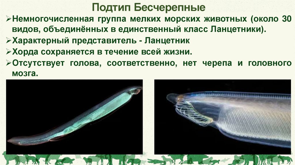 Подтип БесчерепныеНемногочисленная группа мелких морских животных (около 30