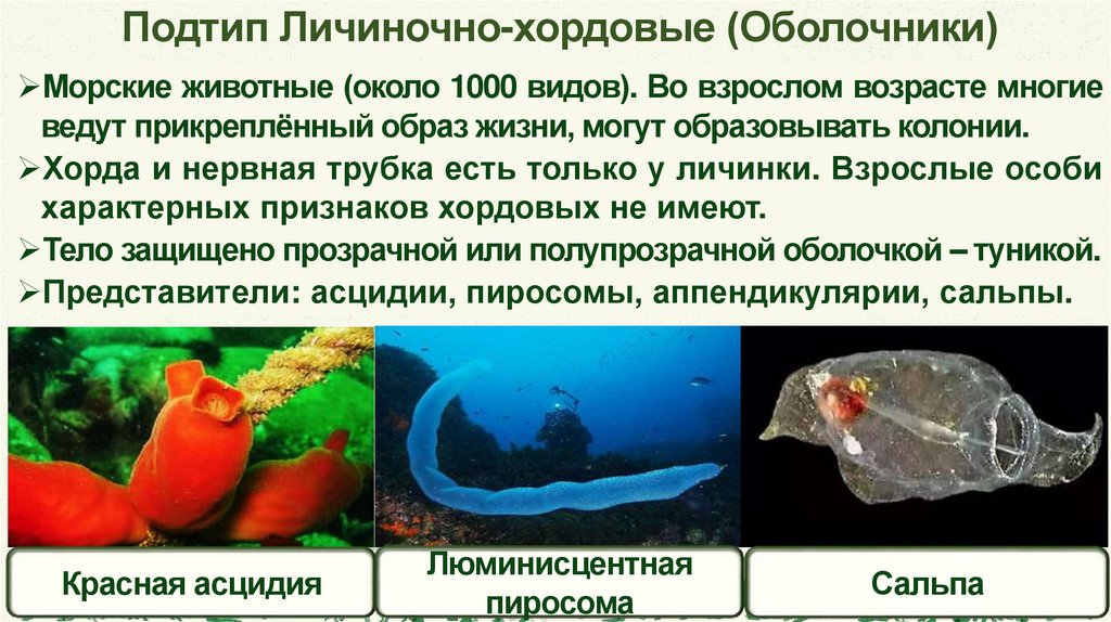 Подтип Личиночно-хордовые (Оболочники)Морские животные (около 1000 видов). Во взрослом возрасте многие