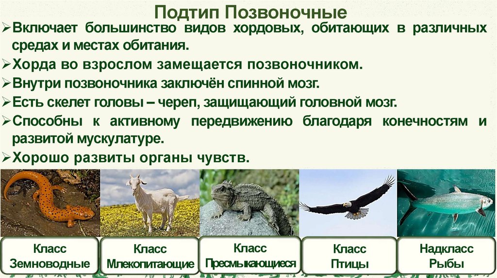 Подтип ПозвоночныеВключает большинство видов хордовых, обитающих в различных