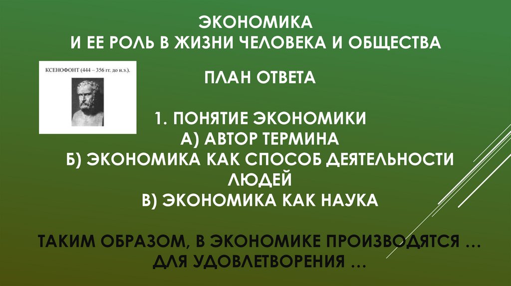 1. План ответа 1. Понятие экономики а) автор термина б) экономика как способ деятельности людей в) экономика как наука Таким