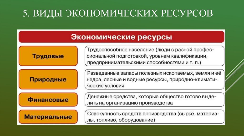 5. ВИДЫ ЭКОНОМИЧЕСКИХ РЕСУРСОВ5. 6. Проблема экономического выбора