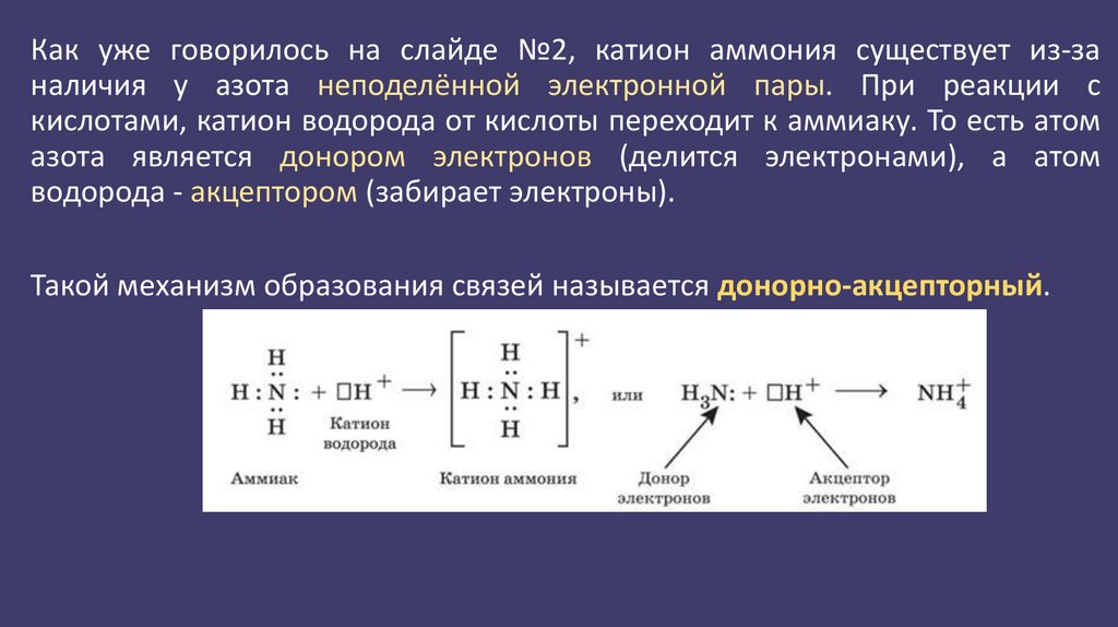 Как уже говорилось на слайде №2, катион аммония существует из-заналичия у азота неподелённой электронной пары. При реакции с
