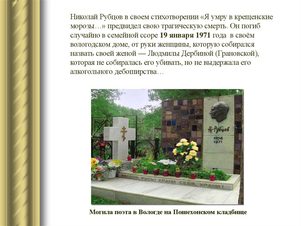 Николай Рубцов в своем стихотворении «Я умру в крещенскиеморозы…» предвидел свою трагическую смерть. Он погиб