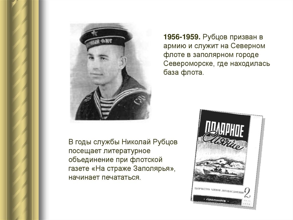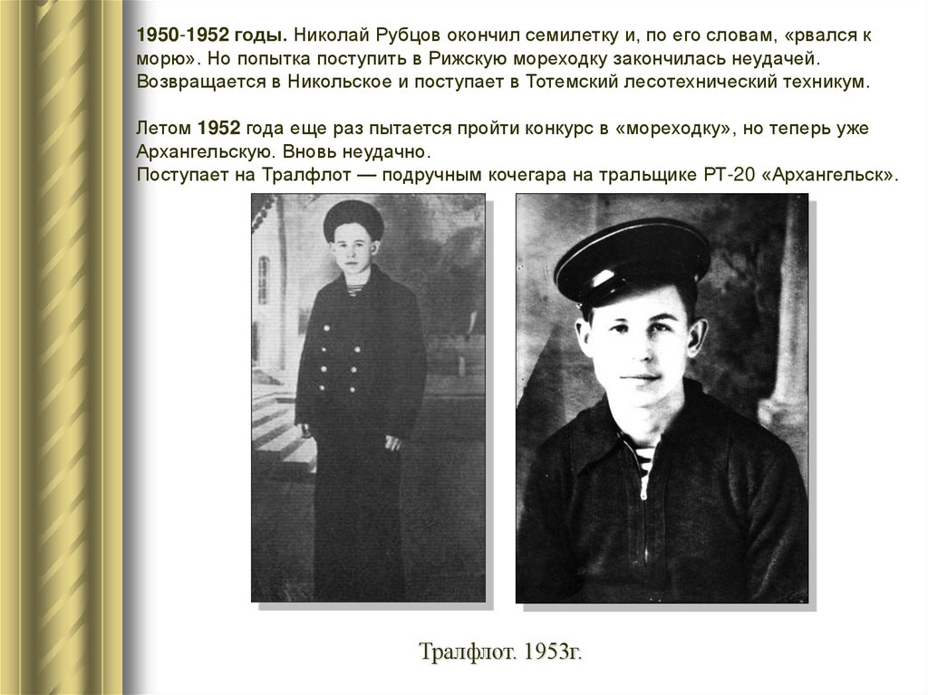 1950-1952 годы. Николай Рубцов окончил семилетку и, по его словам, «рвался кморю». Но попытка поступить в Рижскую мореходку закончилась неудачей.