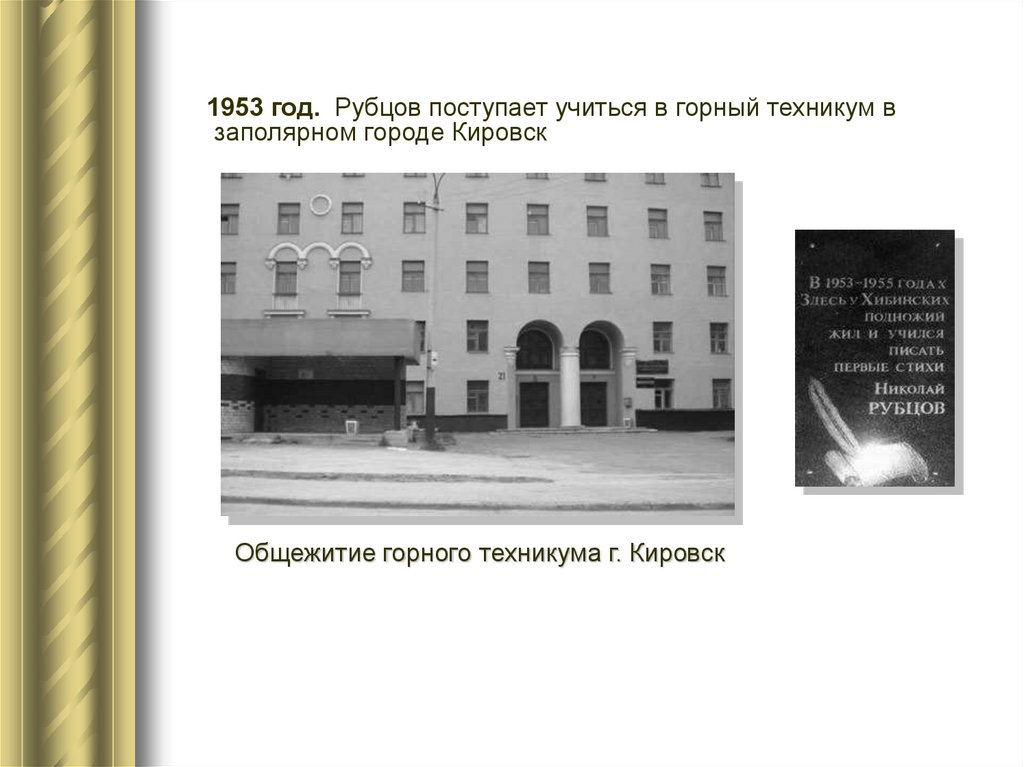 1953 год. Рубцов поступает учиться в горный техникум взаполярном городе Кировск