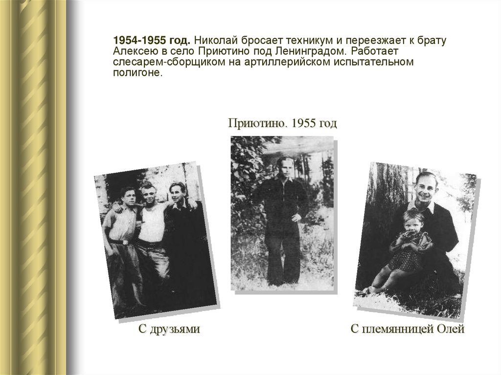 1954-1955 год. Николай бросает техникум и переезжает к братуАлексею в село Приютино под Ленинградом. Работает