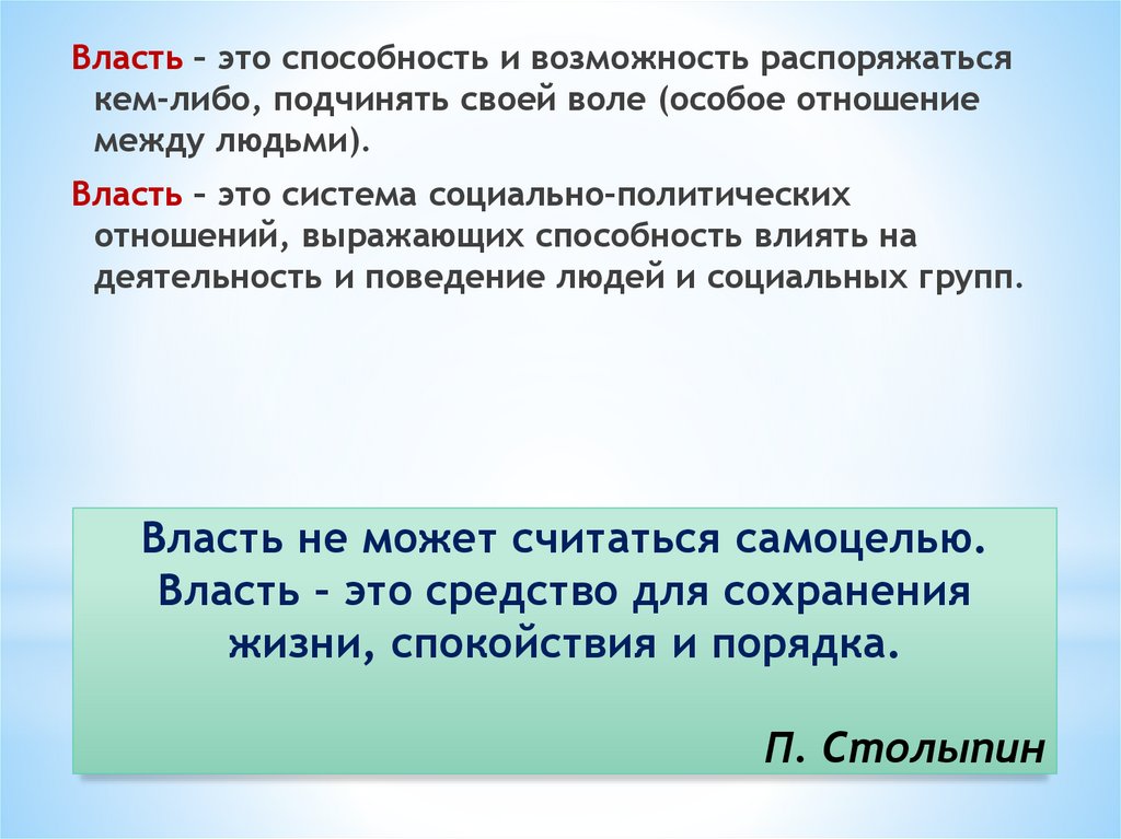 Власть – это способность и возможность распоряжатьсякем-либо, подчинять своей воле (особое отношение