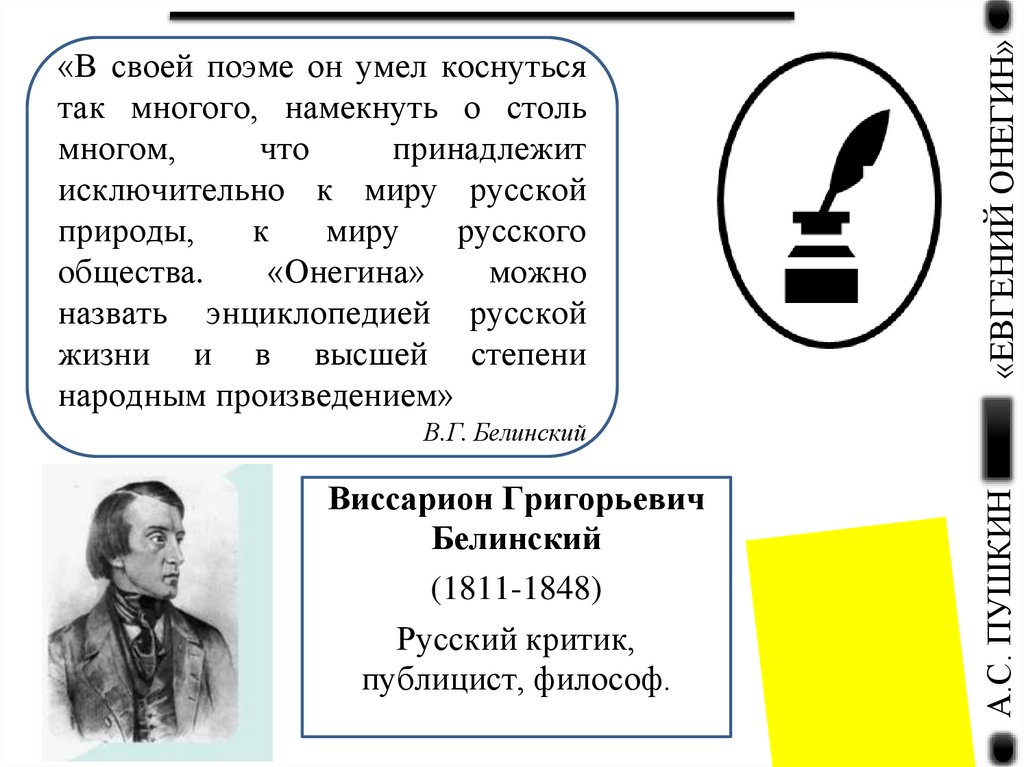 В.Г. Белинский называет роман в стихах «ЕвгенийОнегин» энциклопедией русской жизни, потому