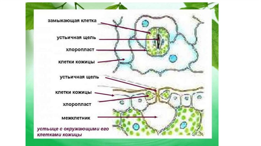 2. Устьица. Среди бесцветных, прозрачных клеток есть две замыкающие клетки, между которыми устьичная щель. В замыкающих клетках