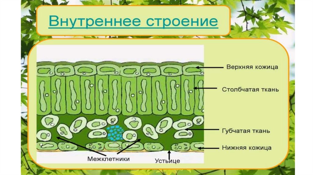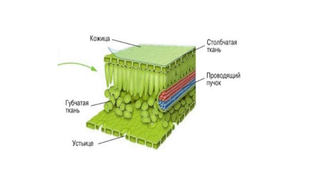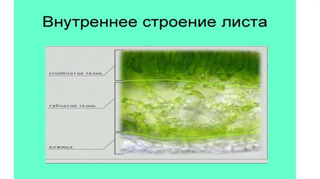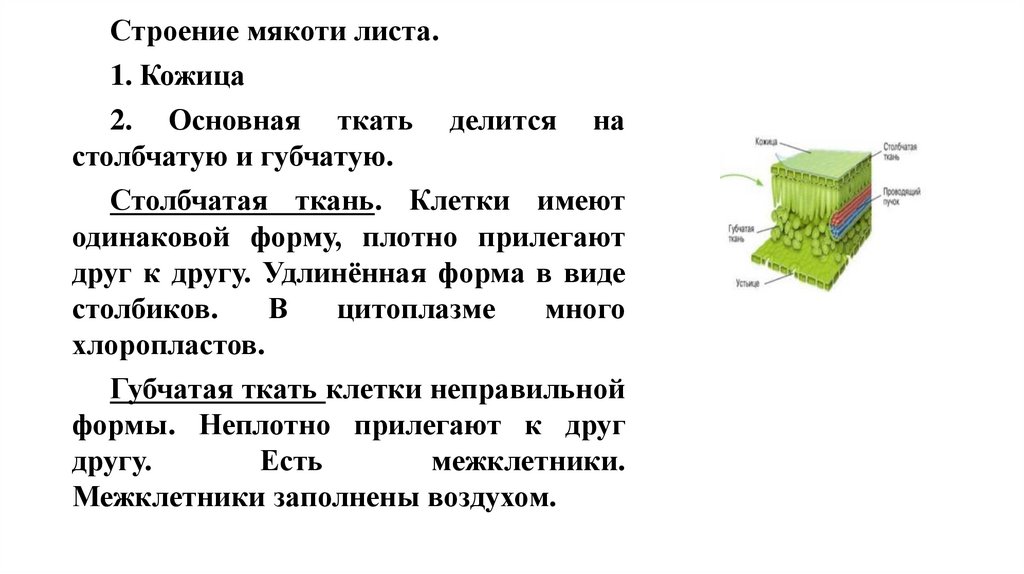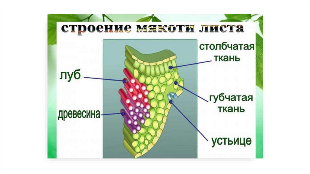 много хлоропластов.Устьица осуществляют газообмен и испарение воды