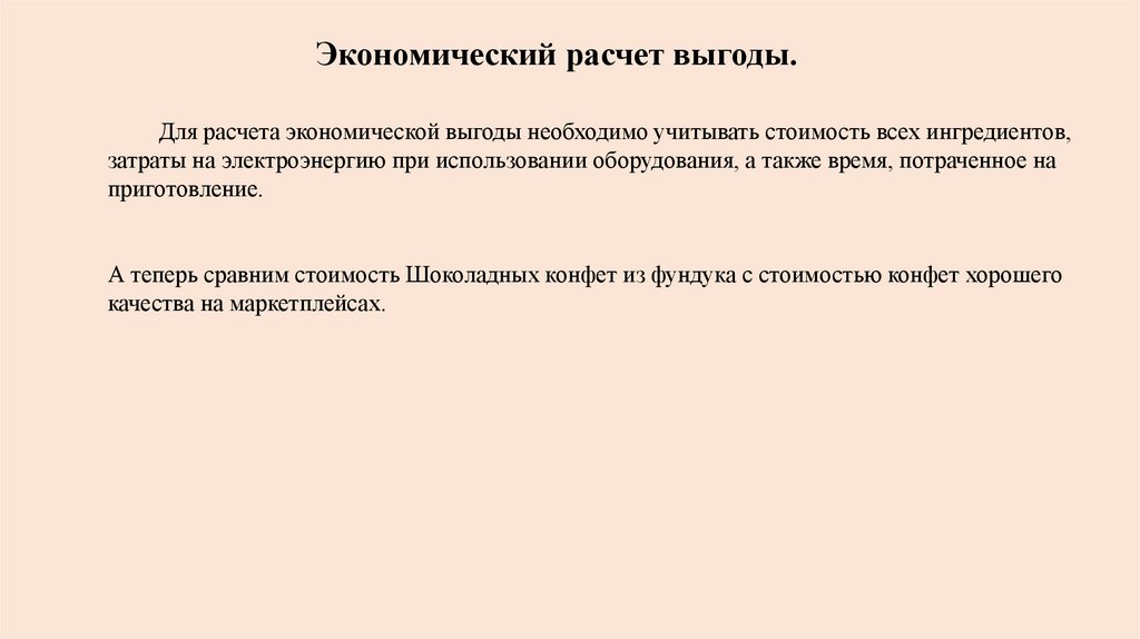 Экономический расчет выгоды.Для расчета экономической выгоды необходимо учитывать стоимость всех ингредиентов,