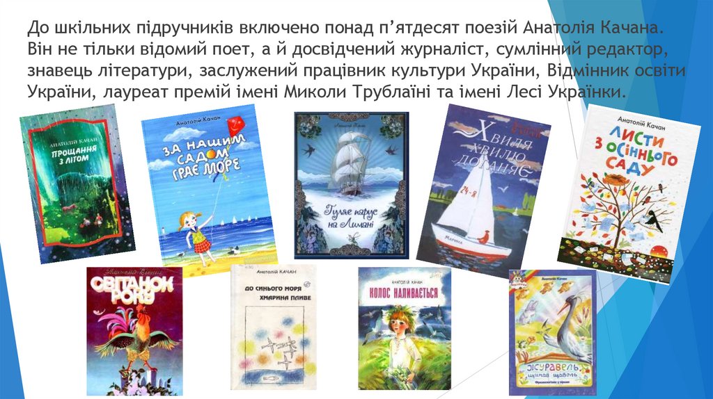 До шкільних підручників включено понад п’ятдесят поезій Анатолія Качана.Він не тільки відомий поет, а й досвідчений журналіст, сумлінний редактор,