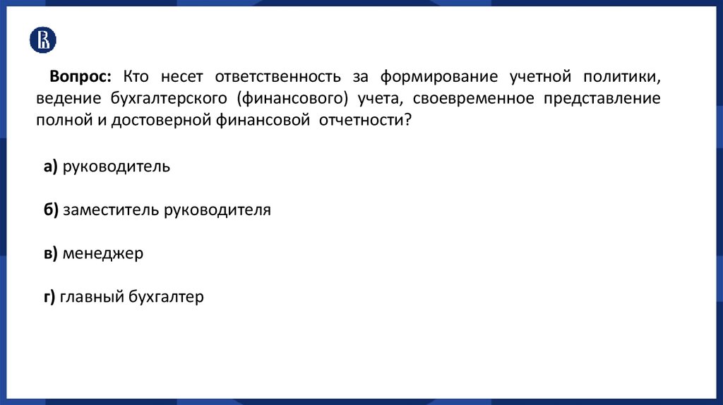 44Вопрос: Кто несет ответственность за формирование учетной политики,