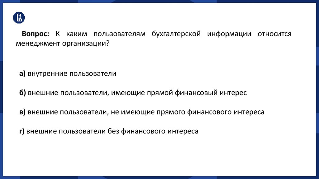 в) внешние пользователи, не имеющие прямого финансового интереса