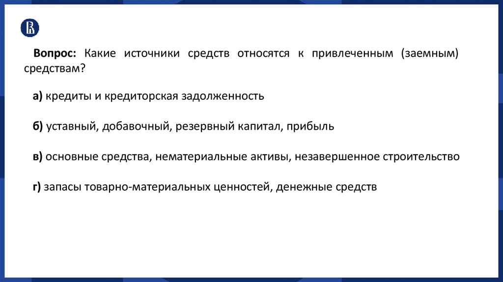 52Вопрос: Какие источники средств относятся к привлеченным (заемным)